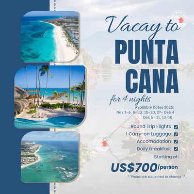 Ready for a slice of paradise? 🌴☀️ Score this amazing 4-night getaway to Punta Cana starting at just US$700 per person! This incredible deal includes: ✅ Round Trip Flights (KIN-PUJ-KIN) ✅ 1 Carry-on Luggage ✅ Accommodation ✅ Daily Breakfast ** Prices are subject to change unless you have made a deposit or payment to secure. We cannot hold airline seats or hotel rooms without a deposit payment. Payment plan available. Contact us or more details.